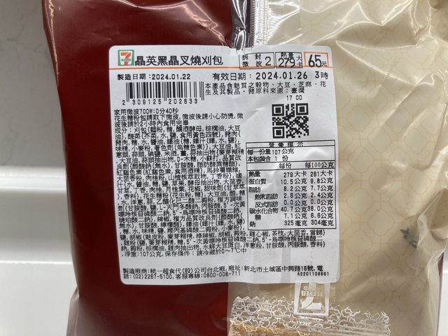 晶英黑晶叉燒刈包:107公克/刈包.酸菜.豬肉.花生糖粉/279大卡