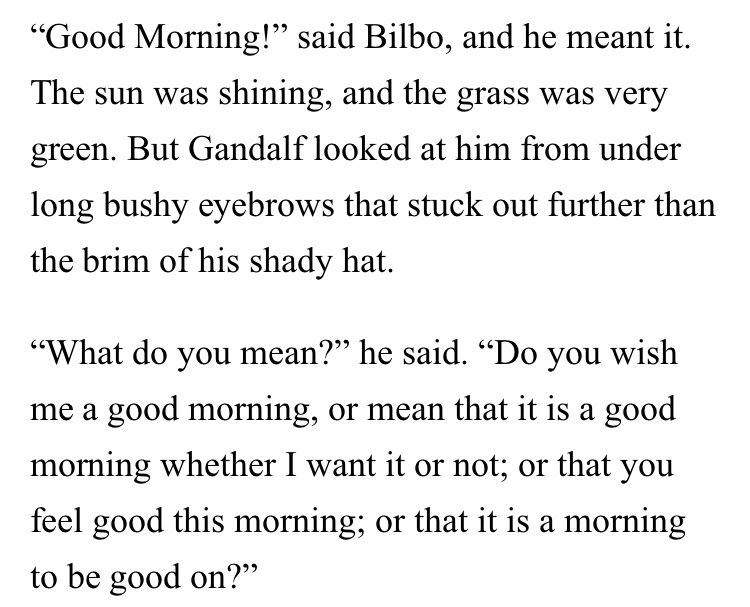 若仔細讀過該段譯文,就會發現鄧老師選用「早上好」,是為了呈現接下來甘道夫一長串