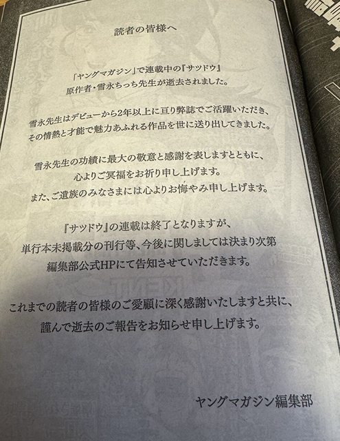 ヤンマガ宣布サツドウ的原作‧雪永ちっち去世