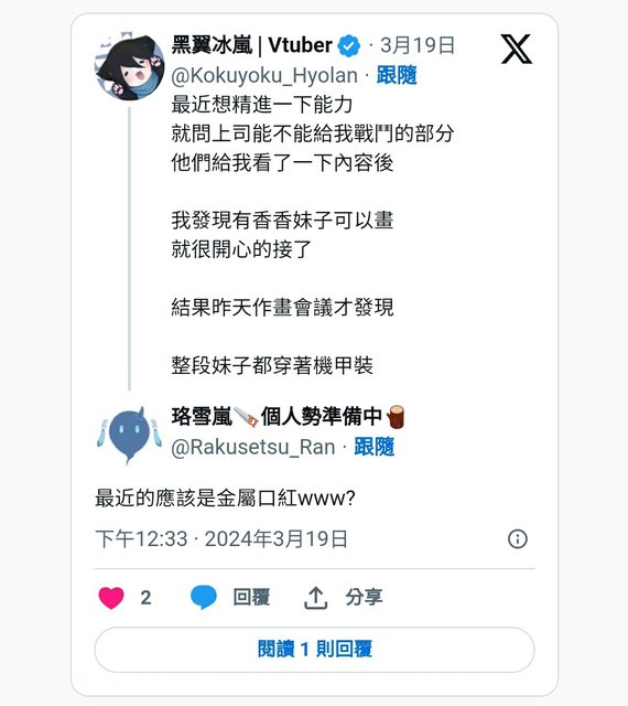 除了分享自己擔任第二原畫的消息,黑翼冰嵐也透露持續在精進自己的能力。為此向上司