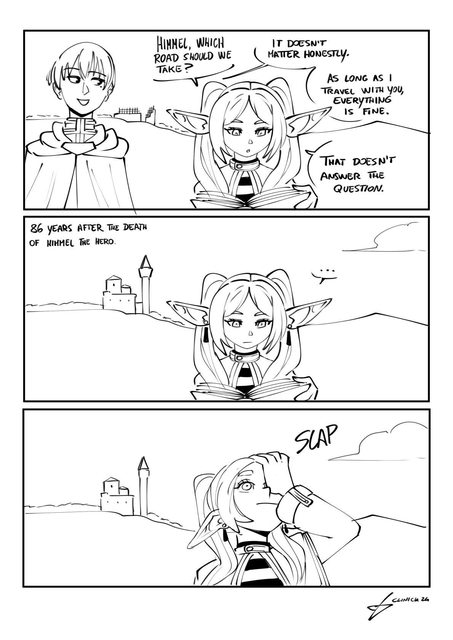 :欣梅爾 該走哪條路? :其實沒關係 只要跟妳一起旅行什麼都好 :那沒回答到我的問題 (欣梅爾死後86年) :啪