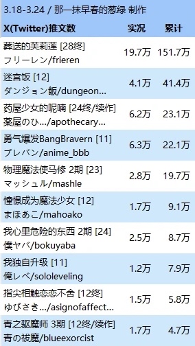 推 kerorok66: 這部討論度不低啊 推特推文數僅次於芙莉蓮 03/28 23:11