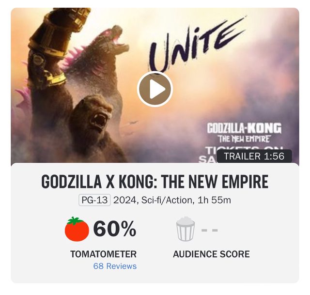 推 gaym19: 怪獸宇宙的番茄度一直都不高 要看爆米花 03/29 07:47