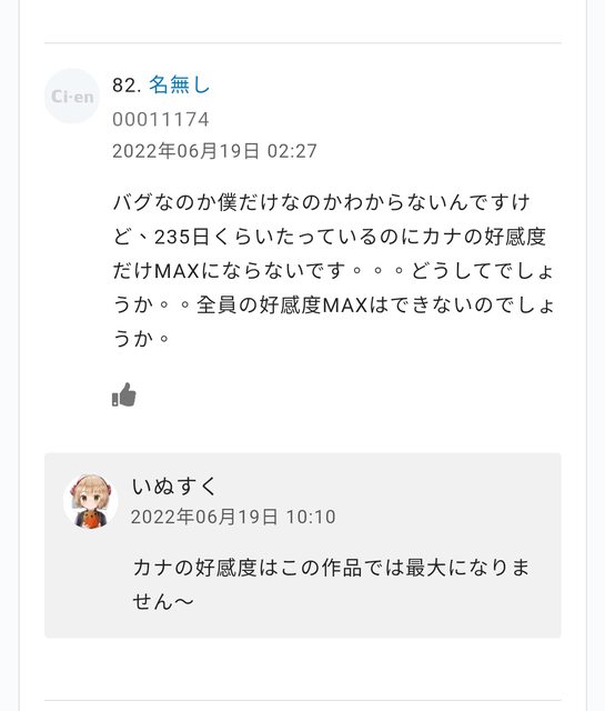 作者回答:加奈的好感度在這款遊戲不會達成最高~