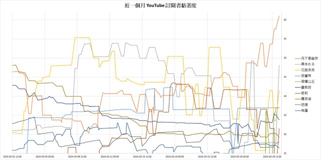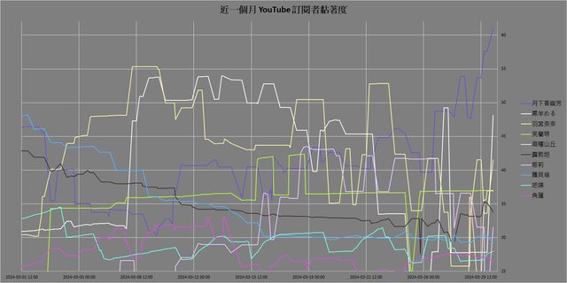 近一個月 YouTube 訂閱者黏著度 [2] 前 10 名: