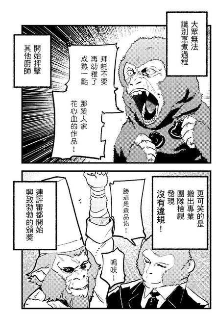 推 nalaculan: 這是虛構的啦~怎麼可能有猴子參加料理比賽,對....... 03/30 19:22