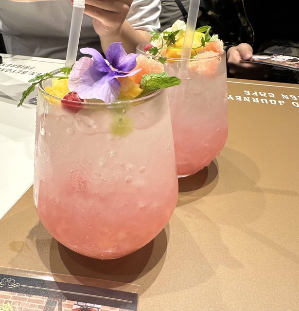 花畑を出す魔法(¥990):蘇打水上裝飾花草跟一些水果,底下不知道是用什麼調成紅