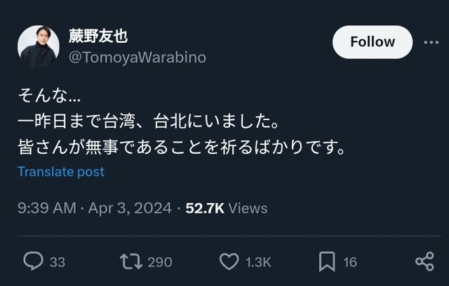 標題[情報] 超人力霸王Blazar 蕨野友也關切台灣地震