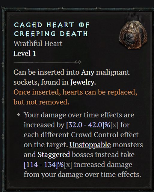 可以鑲嵌至珠寶中的憤怒惡疫鑲孔。鑲入後的惡疫魔心只能替換,不能移除。
