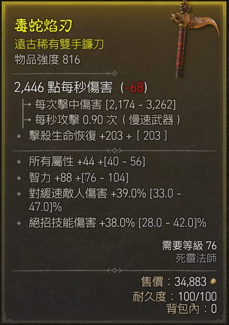 標題[競標] D4賽季 死靈雙手鐮刀強度816