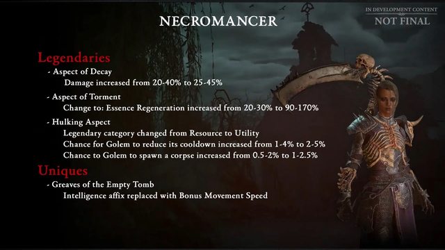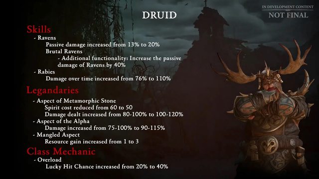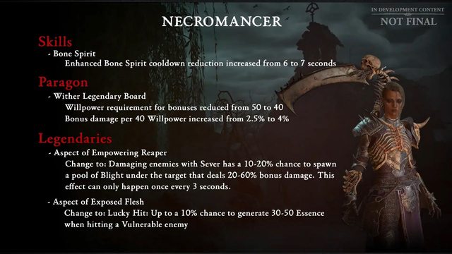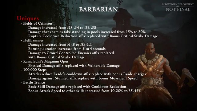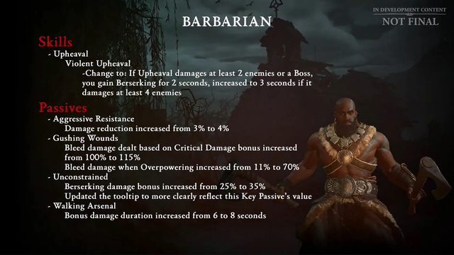 來源:https:/.nga.cn/read.php?tid=37169533&authorid=41004581 法師 親蛇這類威能的負面效果會取消,只提供增益效果 增強生存能力 野蠻人 基礎技能傷害提高 提高傳奇和暗金裝備的收益 地獄錘更新,把對被控制的敵人的傷害改為暴擊傷害 職業調整(正式藍帖前還可能有變動 目前計畫) 法師 https://i.imgur.com/cCeu89Y.jpg