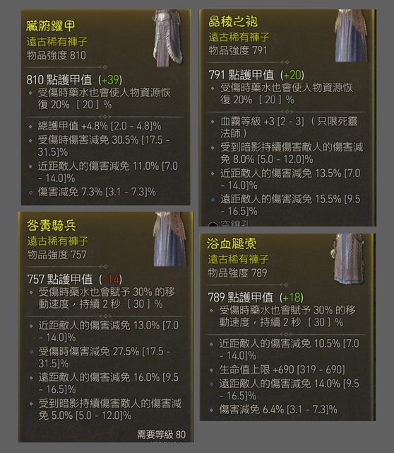 810褲子感覺減傷很優秀,但沒加血量,近傷減也偏低 791褲子讓保命技血霧升級後減少CD,好像有其價值,但暗影減傷太低 757等於是前一件的血霧改減傷版本,但受傷減免對死靈不知是否實用 (直接被秒就無法受傷...) 789有加滿血量,但減傷數值略低,也沒加護甲 該選哪一件褲子,還請幫忙給點意見QQ -- ※ 發信站: 批踢踢實業坊(pttbestweb.org.tw), 來自: 1.163.107.189 (臺灣) ※ 文章網址: https://pttbestweb.org.tw/DIABLO/M.1690875290.A.FFA