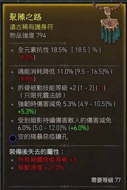 物 品:死靈項鍊 拆骨 消耗降低 減傷 藍孔