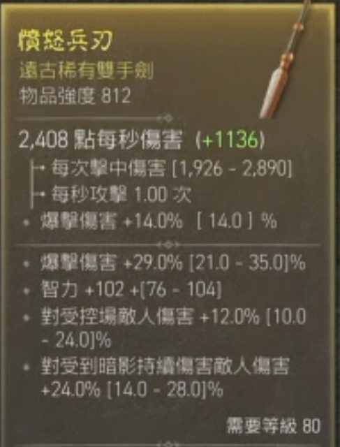 物 品:雙手劍812 爆傷29%、智力102、暗影持續傷24%