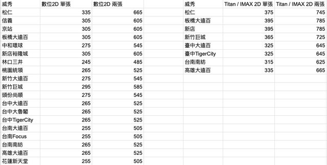 全台威秀代訂費用一覽表(已含手續費)