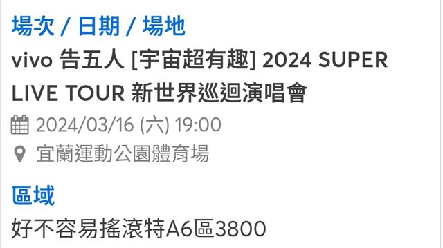 標題[售票] 3/16 告五人 [宇宙超有趣]?- B6連號兩張