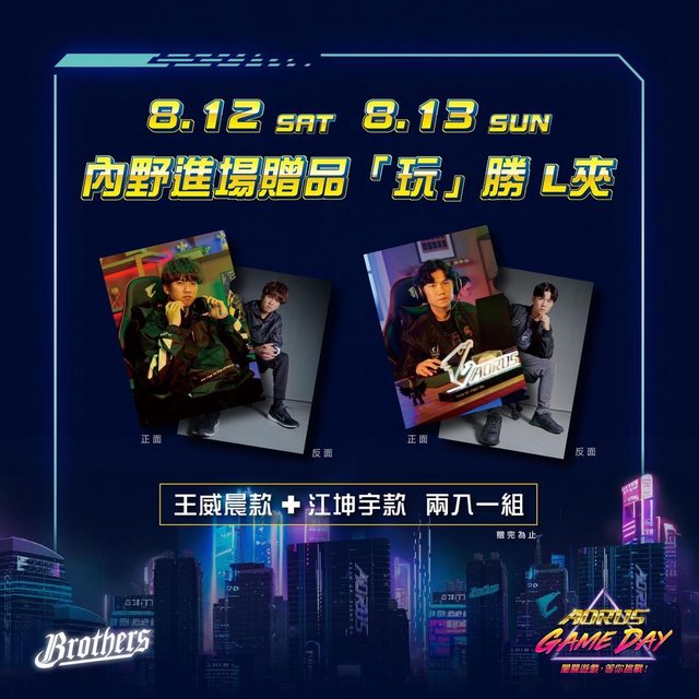 8/12(六)-8/13(日) AORUS Game Day闖關遊戲「內野進場贈品」是本次AORUS品牌大使帥氣代言人王威晨和江坤宇的「玩勝」L夾!