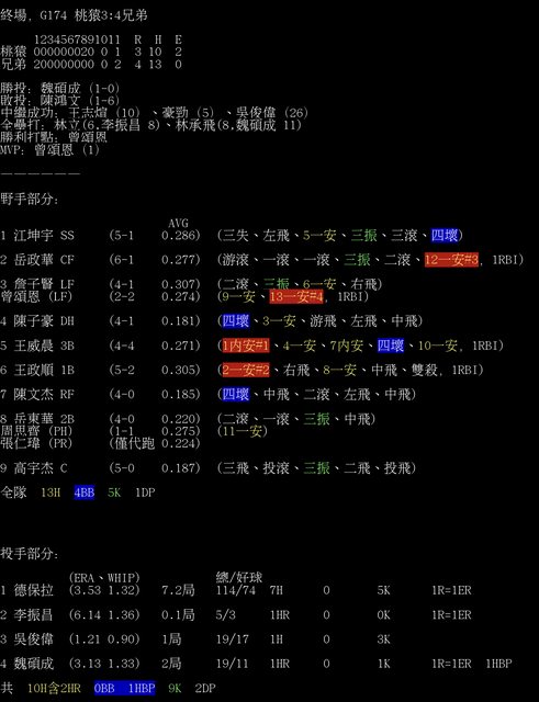 標題[情報] G174 桃猿3:4兄弟 全場數據box
