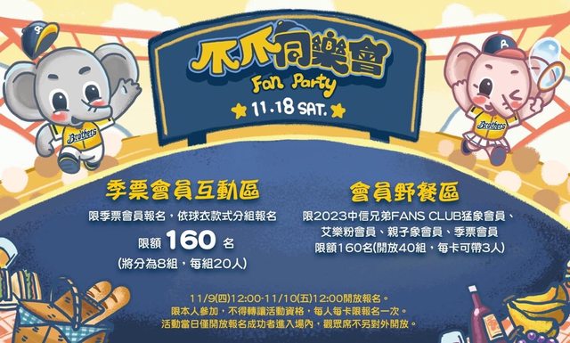 11/9(四)12:00-11/10(五)12:00開放「2023中信兄弟FANS CLU猛象會員、艾樂粉會員、親子象會員、季票會員」報名。