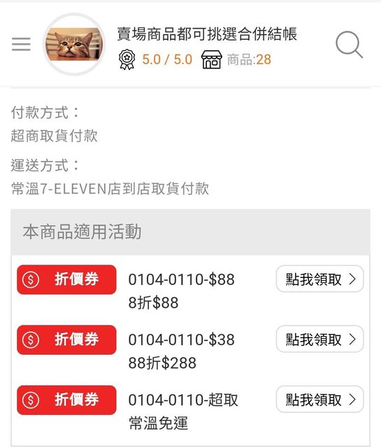 使用7-11 OP會員結帳前領取全站折價券及免運券(折價券使用期限01/04至01/10)