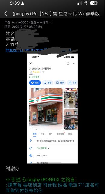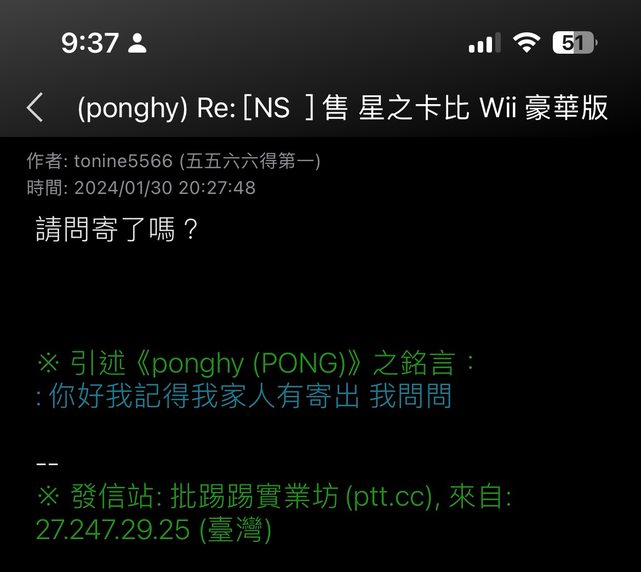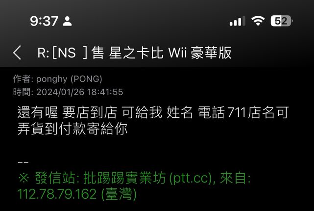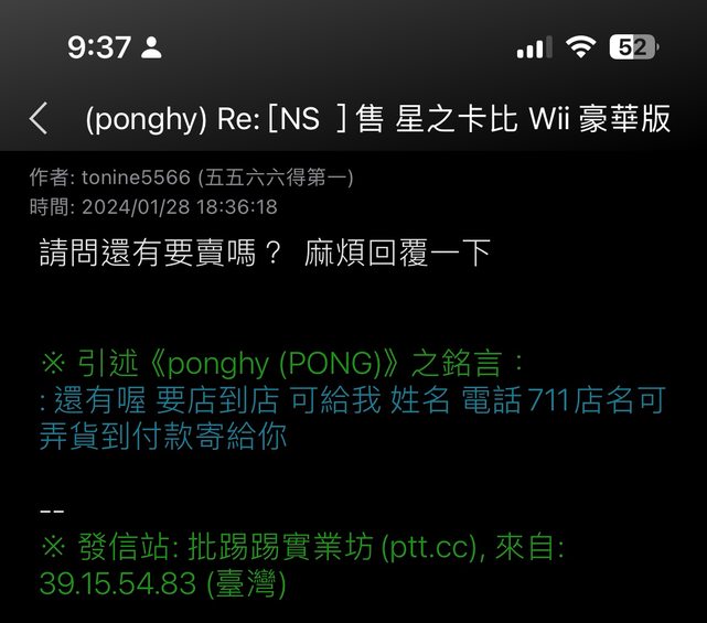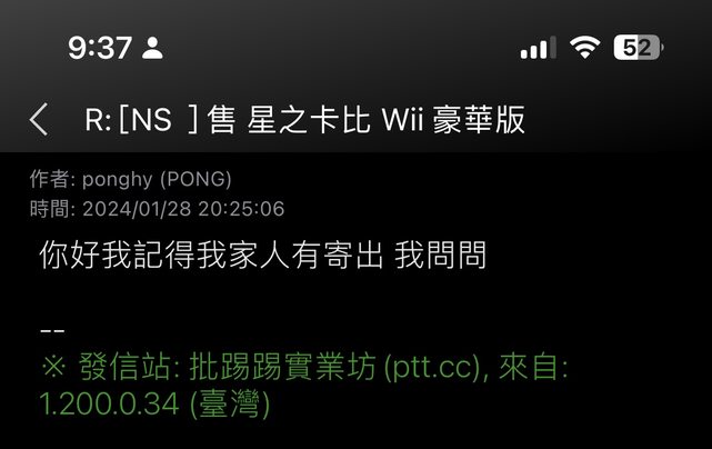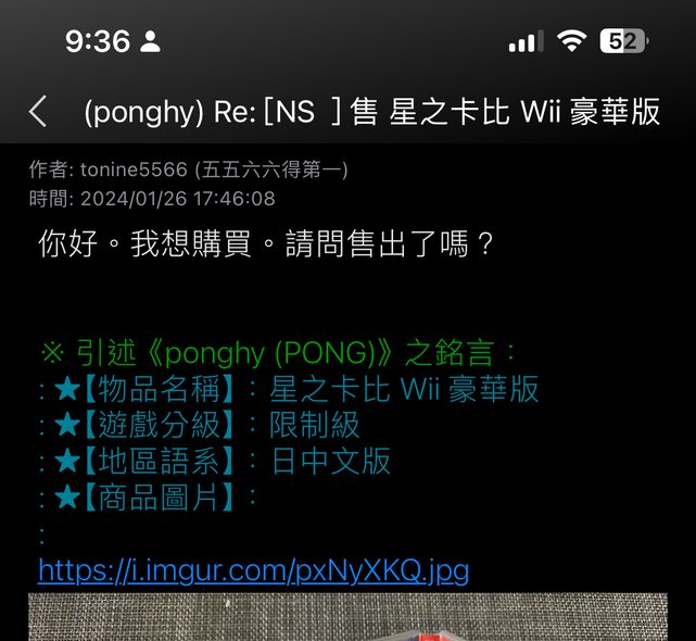 1/26 站內信詢問ponghy 星之卡比WII是否仍可購買,並表示想購買,對方隨即回信詢問