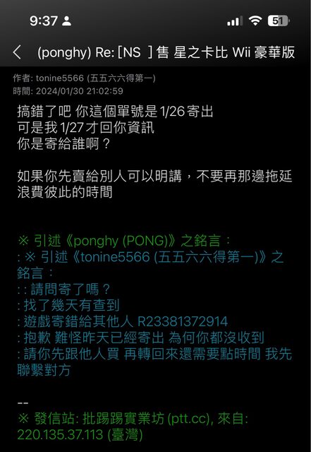 提醒版友與ponghy 交易需留意,他似乎對自己商品的寄送狀況不是很了解,也無法提供