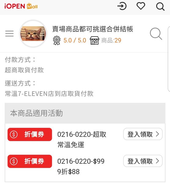 使用7-11 OP會員結帳前領取全站折價券及免運券(折價券使用期限02/16至02/20)