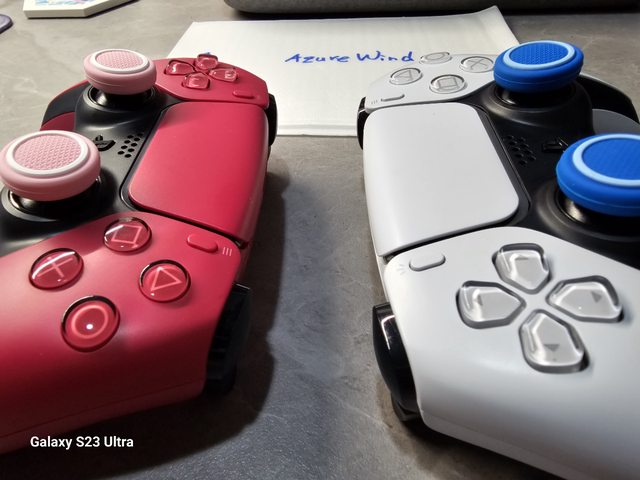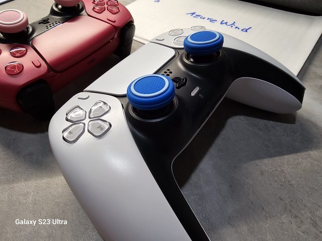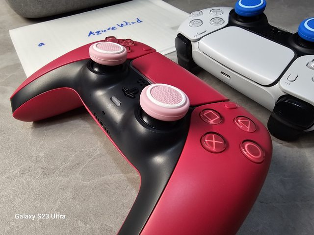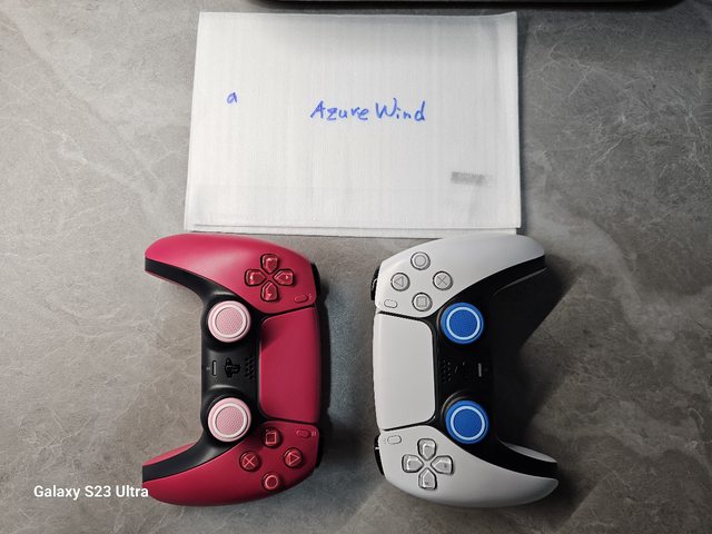 二手DualSense手把兩隻,兩邊的蘑菇頭橡膠破皮,皆已經卸除。目前是套用良值蘑菇頭