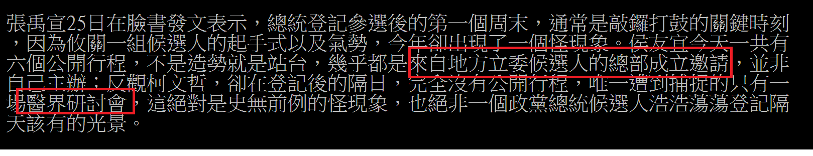 : 自己主辦;反觀柯文哲,卻在登記後的隔日,完全沒有公開行程,唯一遭到捕捉的只有