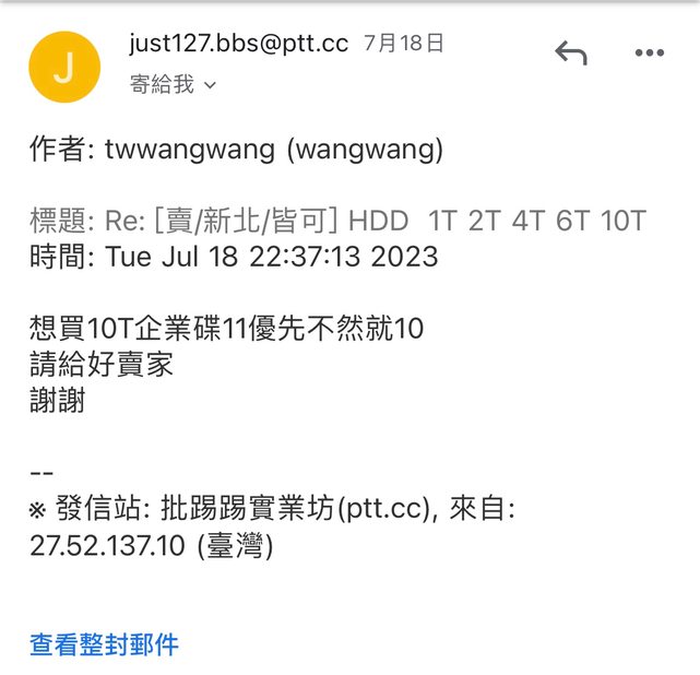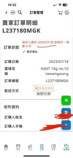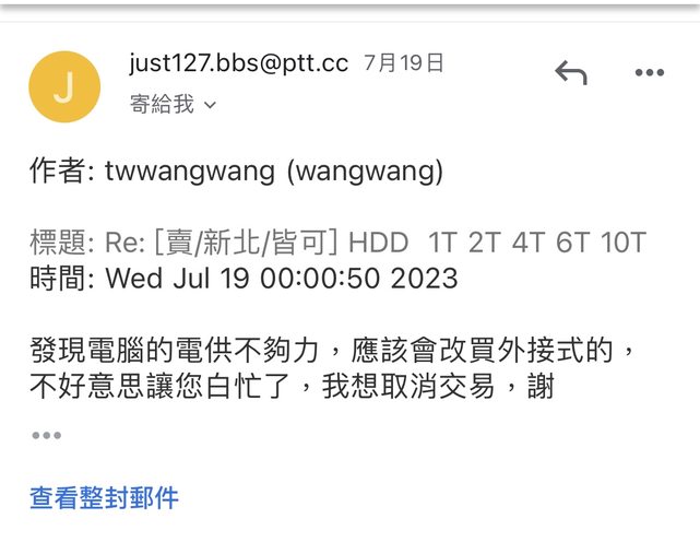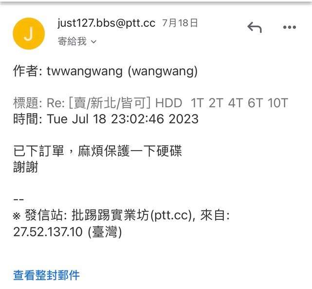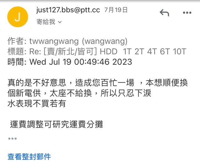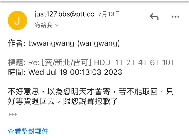 7/18 版上發文販賣用不到的硬碟 依照大家來信順序跟回覆速度 開賣場給購買10t的買家 twwangwang有保障的第三方貨到付款 結果出貨後半小時突然說不要了 我也沒辦法跟全家說取消寄送 貨到現在還卡在花蓮回不 來 https://i.imgur.com/AeG5wn9.jpg