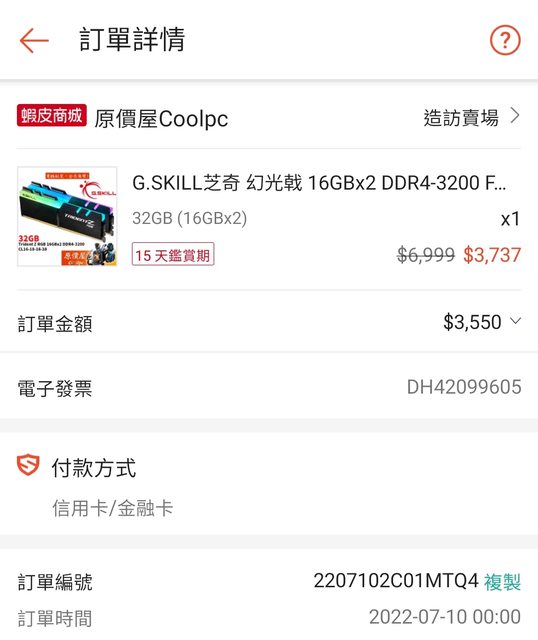 ◎硬體型號: 芝奇 幻光戟 32G(16G*2) DDR4-3200 CL16