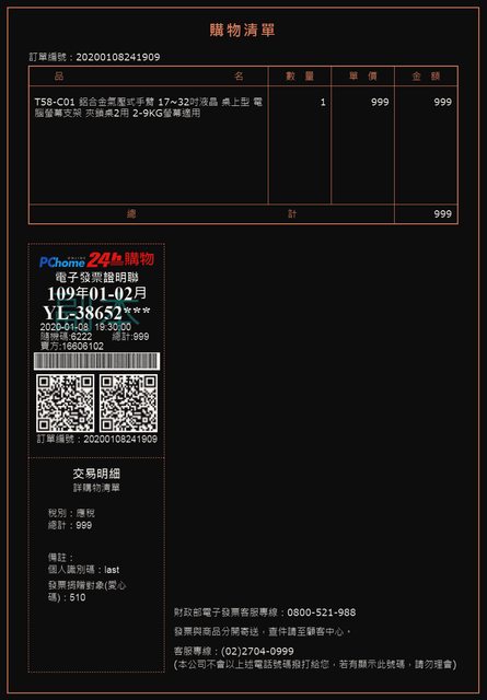 C. 2020年一月從PCHOME購入,僅使用夾桌配件,