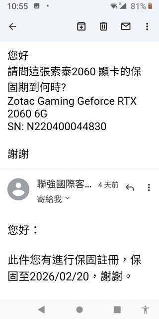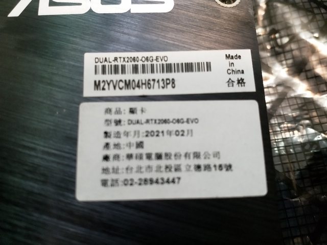 ASUS 2060 DUAL-RTX2060-6G-EVO 保固至2025-03-16 --> 證明請看圖片 技嘉2060 GV-N2060OC-6GD rev. 2.0 保固至2025 第八週 --> 證明請看圖片 索泰2060 保固至2026-02-20 --> 證明請看圖片 MSI 1080 MS-V336 過保,個人保3天 ◎欲售價格: 2060 $3450 1080 $3200 ◎品樣狀況: 公司升級退下,網上及原價屋取得,無完整盒裝,2060品項9成新, 1080 過保,個人保3天 華碩2060只採郵局寄送,郵資$80,其餘一律採取全家郵寄,郵資60 ◎佐證資料: 2060-ASUS