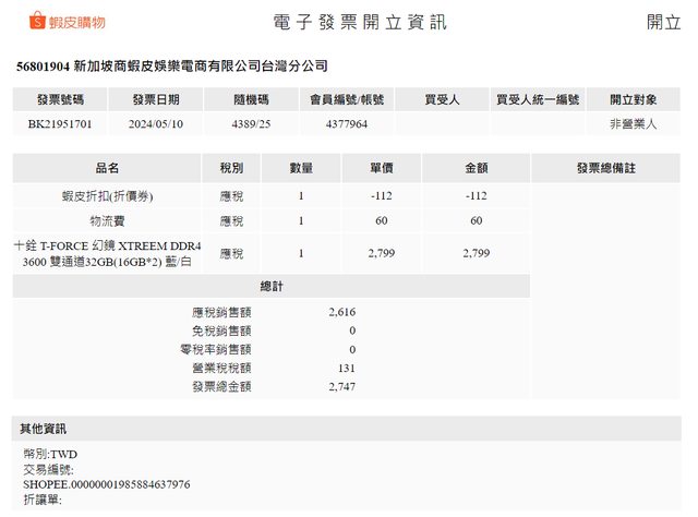 2024/5/10 購於 蝦皮米特3C數位,完整盒裝含電子發票截圖,終身保固