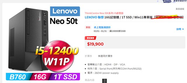 (1) ThinkCentre Neo 50t系列-i5處理器/16G記憶體 / 1T SSD / Win11專業版
