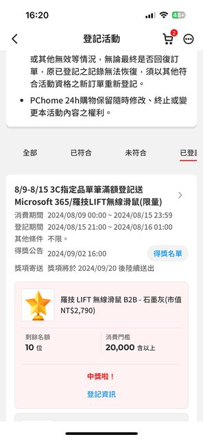 全新, PCHOME抽獎抽中