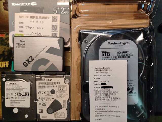 1.保內WD紫標6T 2.過保WD紫標6T*8 3.保內十銓GX2 512G SSD 4.2.5吋TOSHIBA 500G 5.2.5吋HGST 500G