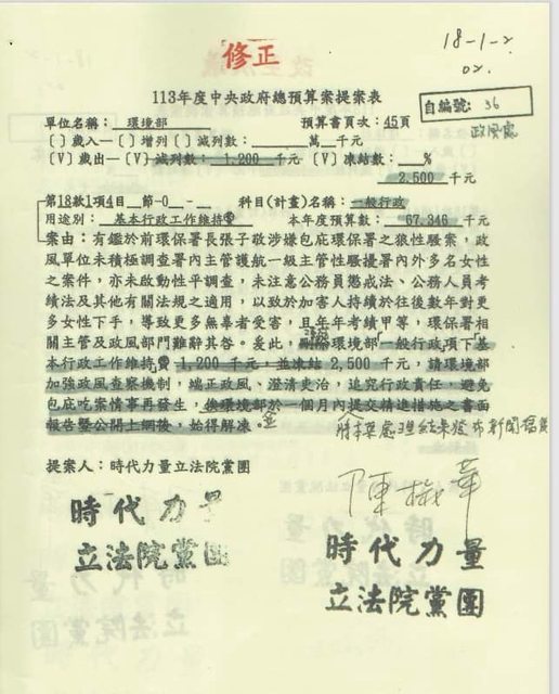 我所提預算凍結案內容如下: 「有鑑於前環保署長張子敬涉嫌包庇環保署之狼性騷案,政