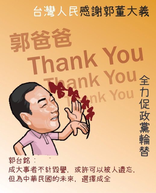 我們都知道,對郭台銘而言,顏色一點都不重要,挺誰也不重要,藍綠白也不重要,重點