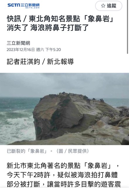 → Kbhuang: 深澳觀光才開放象鼻岩,如今斷裂真是天意 101.10.101.31 12/16 18:13