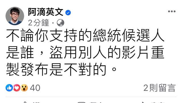 昨天有好事柯粉亂改四年前的阿滴影片, 在左上角壓上「唯一選哲」力挺民眾黨總統候選人柯文哲。 https://newtalk.tw/news/view/2023-12-18/901207 現在阿滴發文反擊了 https://i.imgur.com/YqDZCMC.jpg