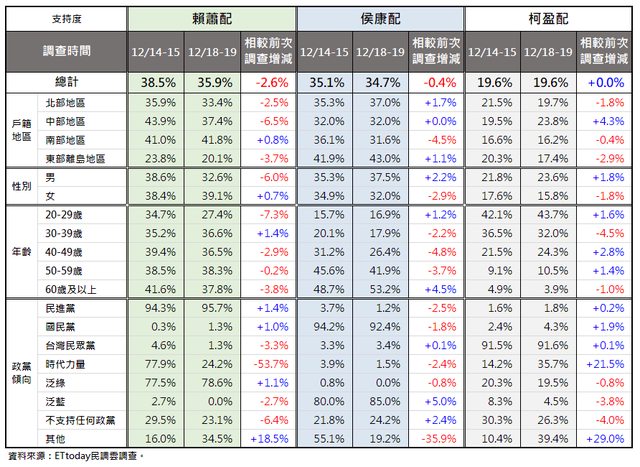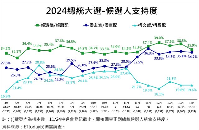 標題[新聞] 12/20 ET民調 賴蕭35.9 侯康34.7 柯盈19
