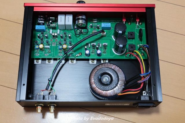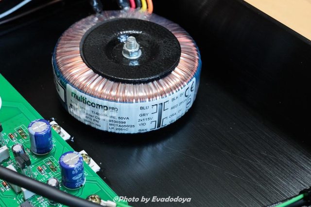 箱子前半段主要是電路板 後半部是變壓器跟RCA輸入
