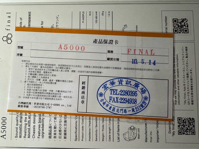 1.產品型號:Final A5000