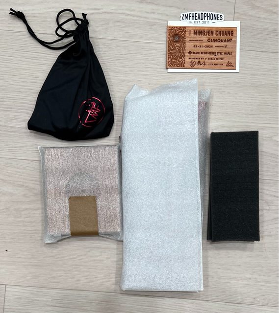 把配件先拿出來,右上是線材包,左上是木質產品保證卡,下面三個是穩定木耳機架跟組