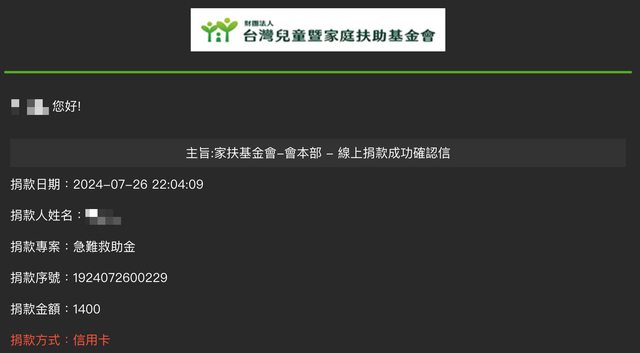 總計再捐款 1400 元給家扶基金會!