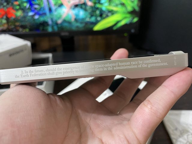 最大的聯名重點,直接把獨角獸鋼彈裡UC元年的憲章刻在側邊