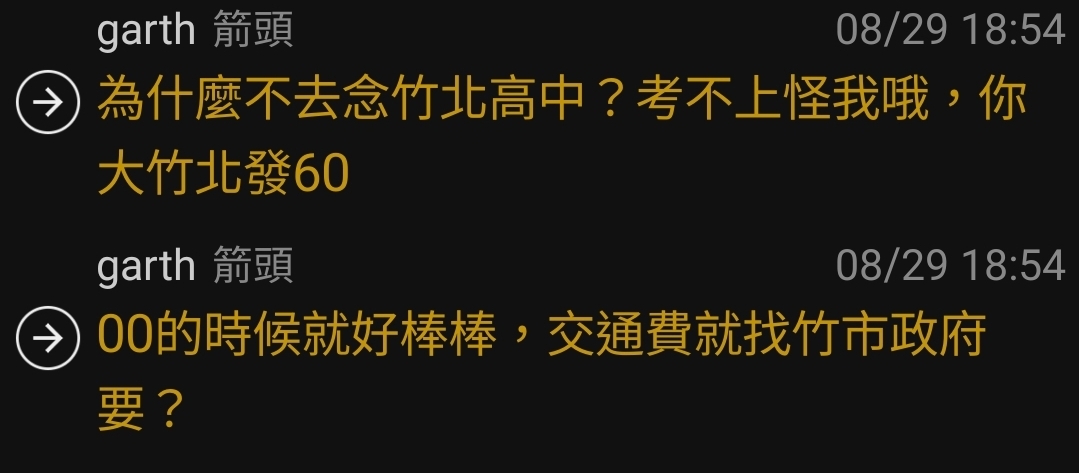 → garth : 搞不清重點就要戰,所以我兒子讀竹中就可以嗆爆你 08/29 23:05