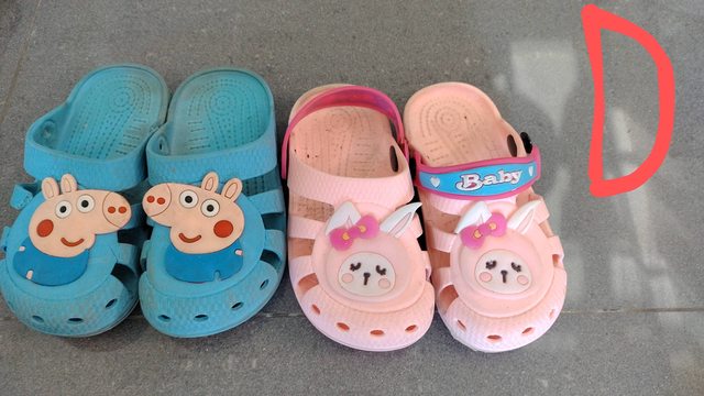 D. 兩雙拖鞋: 3-4歲,如果真的有人需要我再洗刷刷一下 (粉色鞋一隻的帶子斷了)