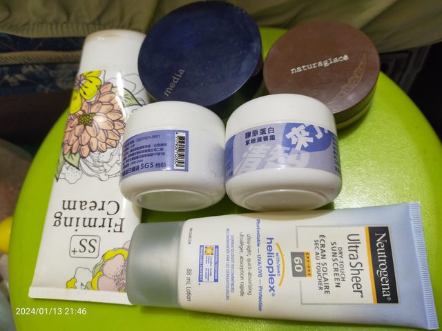 1.media蜜粉5分滿。naturaglace蜜粉八分滿。選舉送的膠元蛋白二瓶至 2025年。護手霜 (過期)